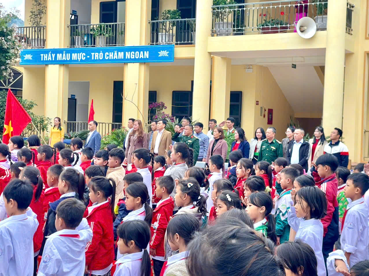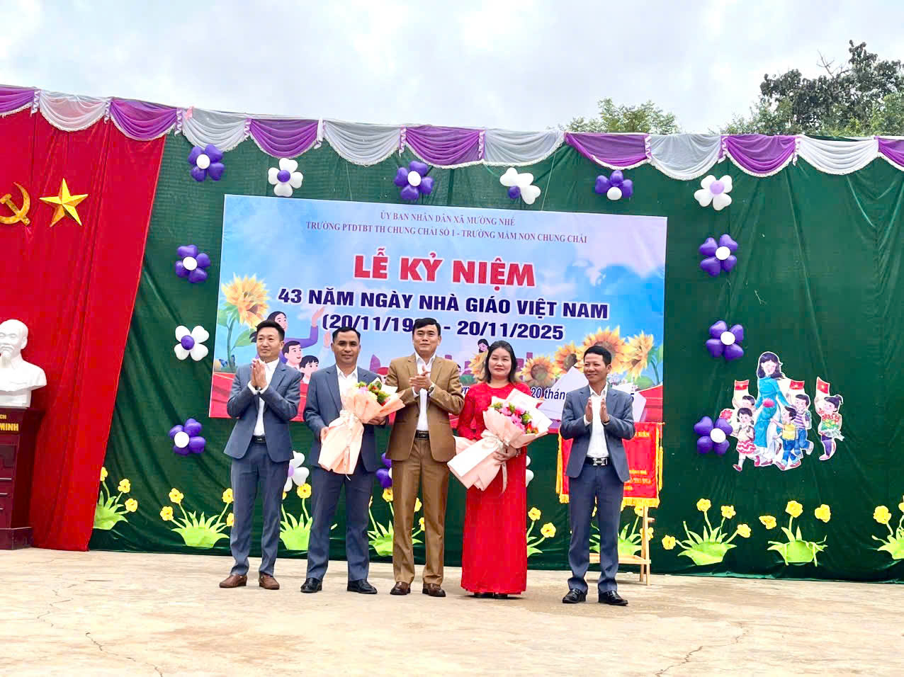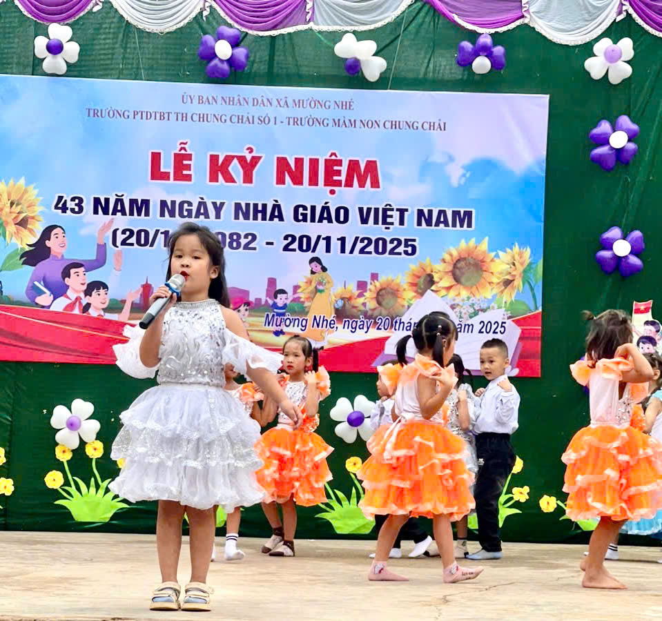 ✧ Tại buổi lễ, lãnh đạo xã đã tặng hoa chúc mừng, ghi nhận những nỗ lực, cố gắng và đóng góp của hai nhà trường trong năm học qua. ✧ Đặc biệt, Trường Mầm non Chung Chải vinh dự được đón nhận Cờ thi đua xuất sắc của UBND tỉnh – phần thưởng cao quý khẳng định thành tích xuất sắc và tinh thần đoàn kết của nhà trường. ✧ Buổi lễ kết thúc trong không khí trang trọng, ấm áp và xúc động để lại nhiều cảm xúc lắng đọng, khẳng định ý nghĩa nhân văn sâu sắc của Ngày Nhà giáo Việt Nam; đồng thời cổ vũ tinh thần cho hai nhà trường tiếp tục phấn đấu, xây dựng môi trường giáo dục ngày càng phát triển, vững mạnh.