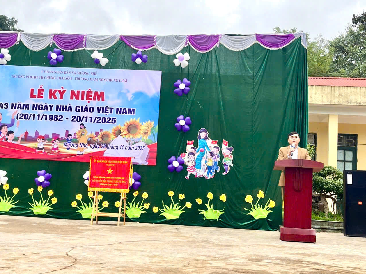★ Trong không khí hân hoan của tháng 11 tri ân. Sáng ngày 20/11/2025 Trường Mầm non Chung Chải và Trường PTDTBT Tiểu học Chung Chải số 1 đã long trọng tổ chức Lễ kỷ niệm 43 năm Ngày Nhà giáo Việt Nam 20/11 và Đón nhận Cờ thi đua xuất sắc. ✧ Buổi lễ vinh dự đón tiếp đồng chí Phan Văn Uyên – Uỷ viên BTV Đảng ủy, phó Chủ tịch UBND xã; đồng chí Trần Thị Hải – Uỷ viên BCH Đảng bộ, trưởng phòng Văn hoá – xã hội cùng các đồng chí đại diện các ban ngành, đoàn thể địa phương, Ban đại diện cha mẹ học sinh, toàn thể Cán bộ–Giáo viên–Nhân viên và Học sinh của hai nhà trường. Đ/C: Phan Văn Uyên – Uỷ viên BTV Đảng ủy, phó Chủ tịch UBND xã.